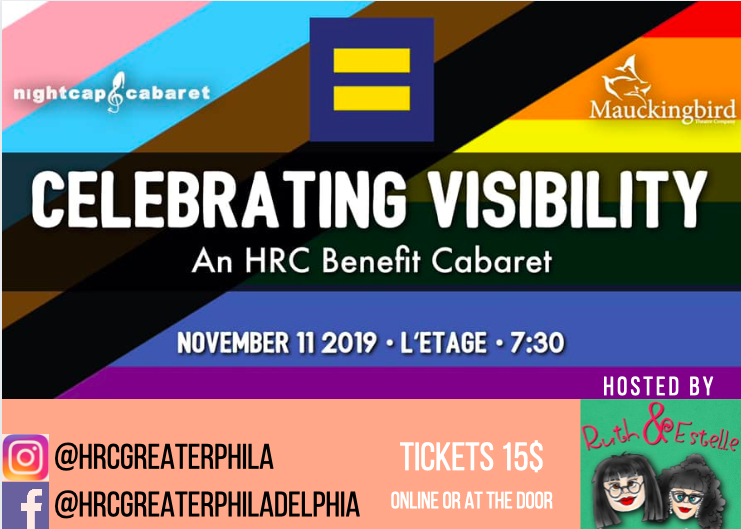 Come celebrate LGBTQ visibility with the Human Rights Campaign! HRC Greater Philadelphia is producing a benefit cabaret at L’etage, in partnership with Nightcap Cabaret and Mauckingbird Theatre Company. Hosted by Philadelphia's newest yet somehow oldest comedy duo Ruth and Estelle! The cabaret will include musical performances from many of Philly’s finest LGBTQ artists and allies!